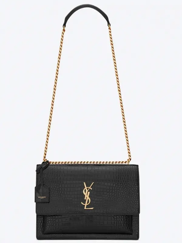 Black Croc-Embossed Leather YSL Sunset Medium Chain Replica Bag
