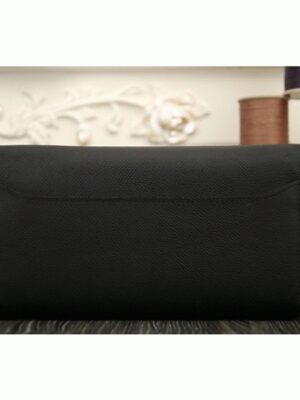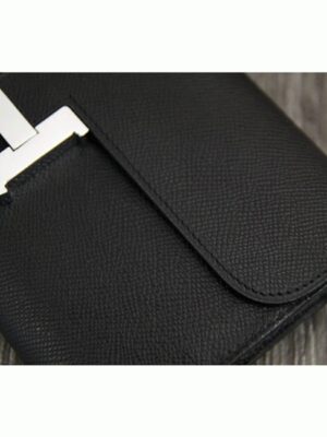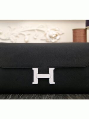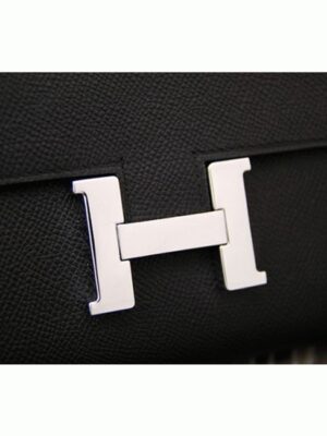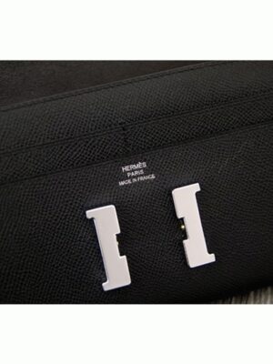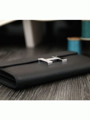 This wallet, inspired by the Hermes Constance bag, is a compact version that retains the iconic H logo and flap closure. It is slightly smaller and wider to provide better practicality while keeping the recognizable design of the Constance. Inside, there are twelve credit card slots, two flat pockets, a zipped coin compartment, plus front and rear pockets for extra storage.