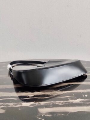 Featured in the House’s Multiple Views Spring/Summer 2021 collection, the Prada Cleo shoulder bag previews the collaboration between Miuccia Bianchi Prada and co-creative director Raf Simons. Crafted from Prada’s signature brushed leather, known for its unique texture, this bag presents a sleek, curved silhouette reminiscent of classic Prada designs from the 1990s and 2000s. It beautifully captures the collections theme of blending futuristic elements with traditional style.