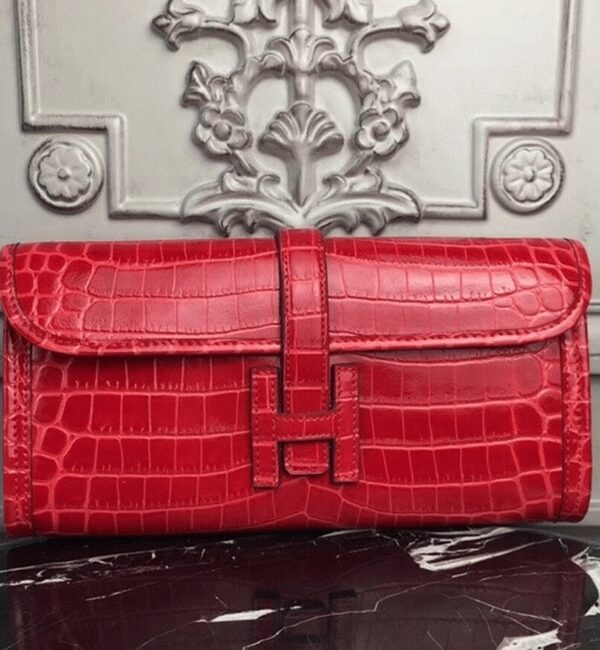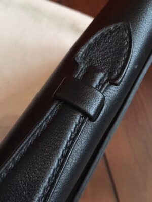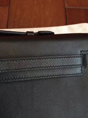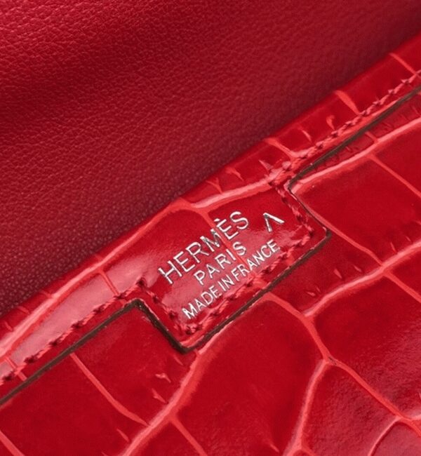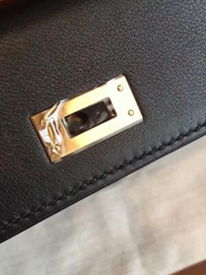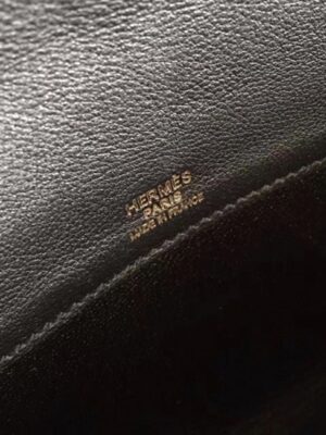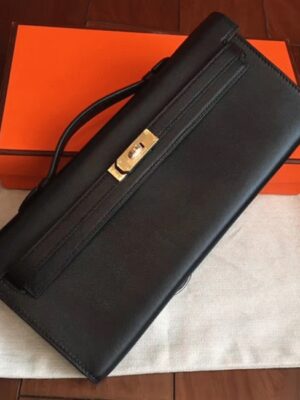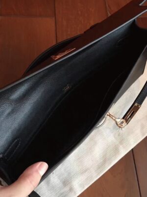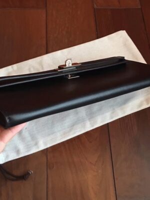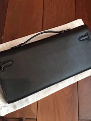 Designed with elegance in mind, this clutch features a long rectangular form inspired by the Hermes Kelly icon. Its small top handle and tasteful front clasp allow for a graceful transition between formal events and evening occasions.