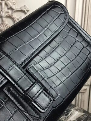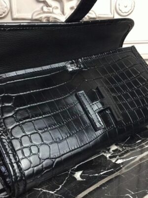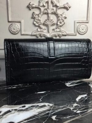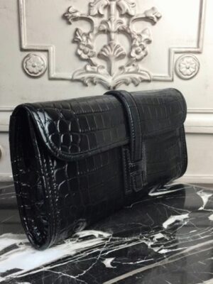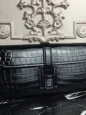 The distinctive Jige clutch presents a compact form enhanced by the H logo closure. The leather flap slips under the H clasp and is emphasized with standout contrast stitching. With its sleek design and minimal hardware, this clutch is perfect for casual, office, and everyday use. Constructed from 100% crocodile embossed calf leather. Flap top with H logo closure. Leather lining inside. Size: 29 x 15 x 3 cm. Includes a Hermes dust bag and certificate card.