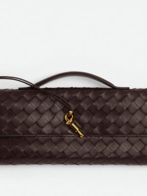 The Andiamo Clutch by Bottega Veneta showcases the exquisite craftsmanship of mirror-laminated lambskin leather. It is a perfect example of the brand’s attention to detail. The bag is handwoven using the iconic intrecciato technique and is finished with a distinctive gold-tone metal knot clasp. Inside, there’s ample space for essentials like your lipstick, cardholder, and phone.