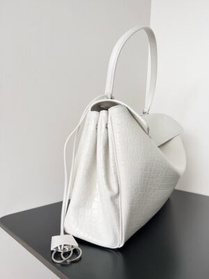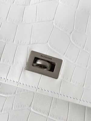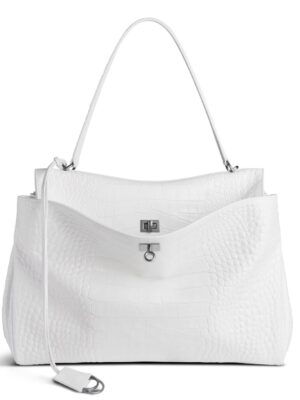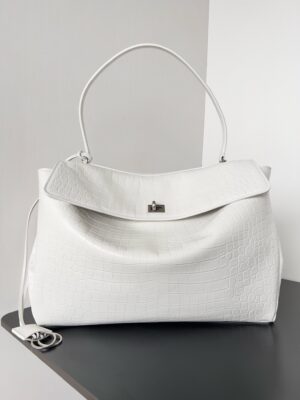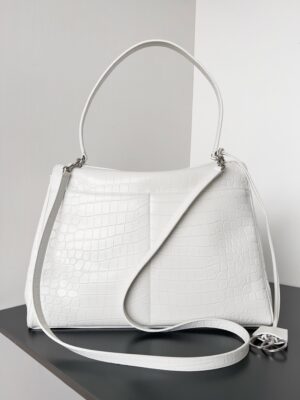 Balenciaga’s Rodeo Bag, launching on May 10th, 2024, will offer a textured crocodile-embossed calfskin design, adding an elevated edge to the bag’s already sophisticated style. This iconic tote combines pre-worn pleats, raw edges, and soft piping, capturing a sense of timeless elegance.