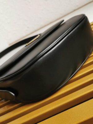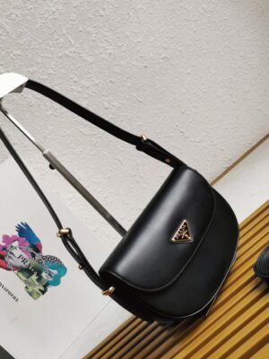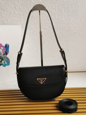 Prada presents this shoulder bag as a perfect example of the brands elegant style. Featuring the signature triangle logo, the bag includes a two-tone embroidered shoulder strap that complements the gold-tone lettering logo, all set on a grained leather surface for added texture.