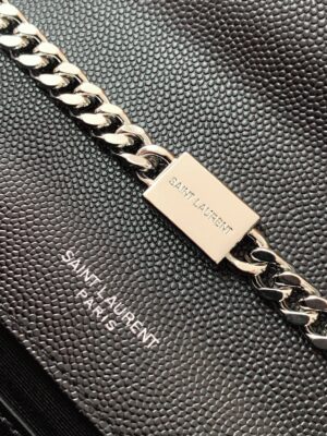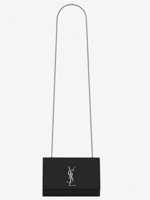 This Kate shoulder bag by Saint Laurent, featuring the YSL logo first created in the 1960s, is the epitome of timeless glamour. The flap opens to reveal a well-sized interior for your phone and lipstick. You can wear it with the silver-toned chain strap or tuck it in to use as a clutch. 100% leather calfskin Front flap with YSL metal signature Magnetic snap closure Silver-tone metal components Grosgrain lining One flat interior pocket Chain shoulder strap with 56 cm drop Size: 7.9 x 4.9 x 1.9 inches Includes Saint Laurent dustbag, box, and certificate card