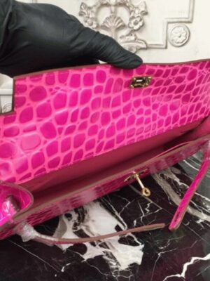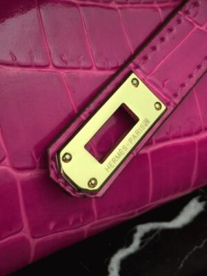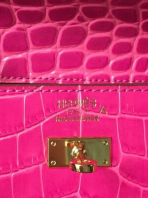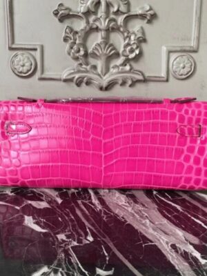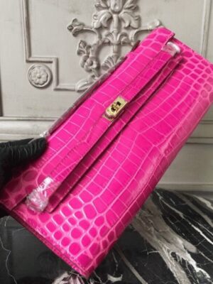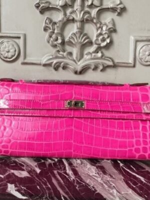 Channeling classic femininity, this luxurious clutch draws inspiration from the iconic Hermes Kelly with its extended rectangular shape and smart top handle. The buckle closure adds a final touch of refinement, ideal for both daytime sophistication and evening elegance.