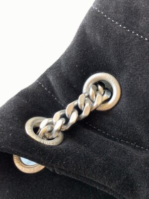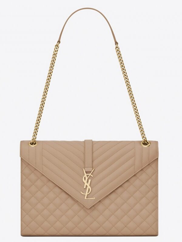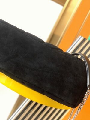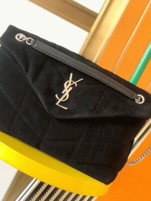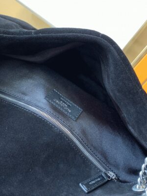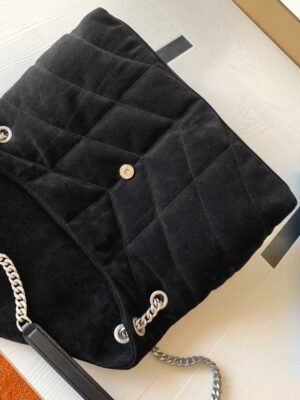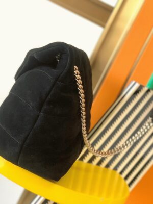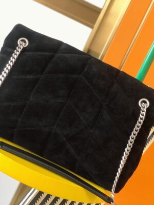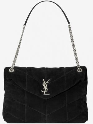 The Saint Laurent Puffer bag honors Loulou de la Falaise, an iconic muse and close friend of Yves Saint Laurent. This luxurious piece is crafted from soft suede calfskin and features the signature YSL plaque at the front. Its versatility is highlighted by a sliding chain strap, allowing you to wear it doubled up as a shoulder bag or extended for a longer fit. Inside, the bag offers ample space, with a zippered pocket for organizing daily essentials like a water bottle, phone, and tablet.
